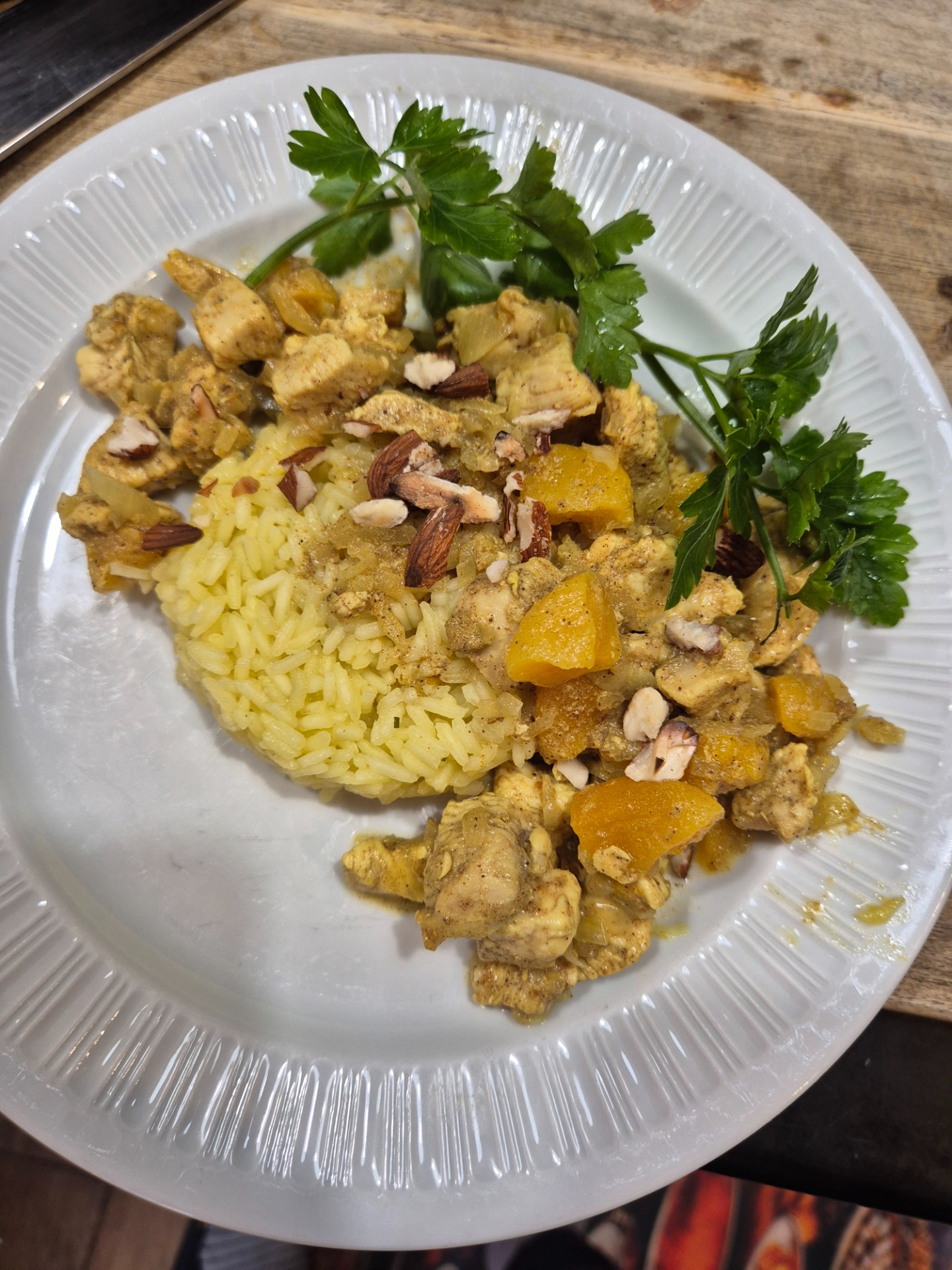Ez az étel egy édes-fűszeres marokkói hangulatú fogás, amely sárgabarackkal, mézzel, fűszerekkel és egy csipet citrommal készül. Rizságyon tálalva, roppanós mandulával megszórva az igazi. Nálunk akkora sikert aratott, hogy egyből dobozolták is munkába!